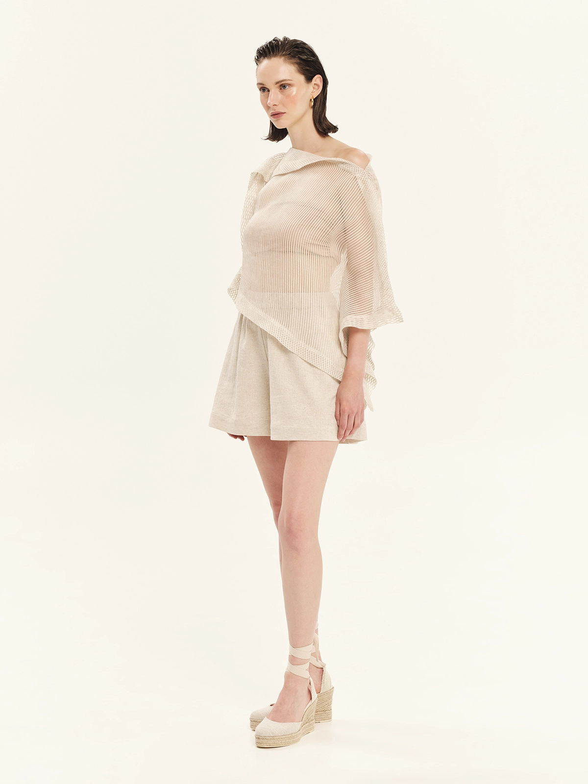 Shorts with an elastic waistband, crafted from a cotton-linen blend. Featuring a relaxed fit and side pockets, they are practical and easy to wear. The gauze-like texture of the fabric adds a unique, summery vibe to them with a resort-inspired feel.