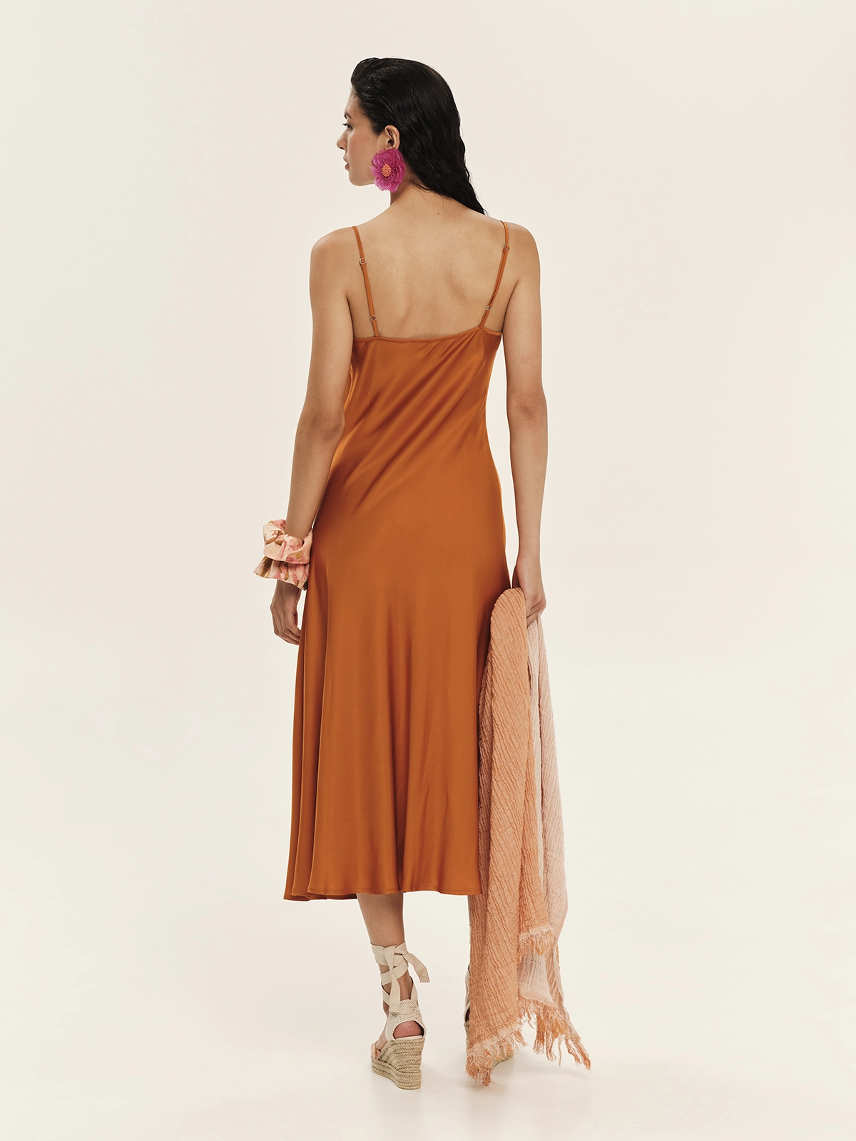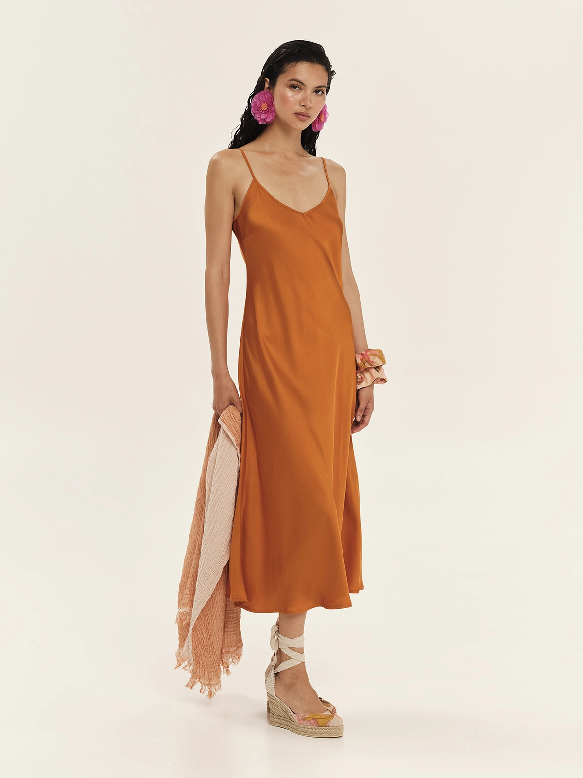 Slip dress crafted from silky viscose with a “V” neckline, designed in a clean, fluid silhouette that gently follows the body with understated femininity. The silky texture offers natural movement and refined sheen, highlighting the minimalist character of the design. A timeless and elegant dress for evening and special occasions.