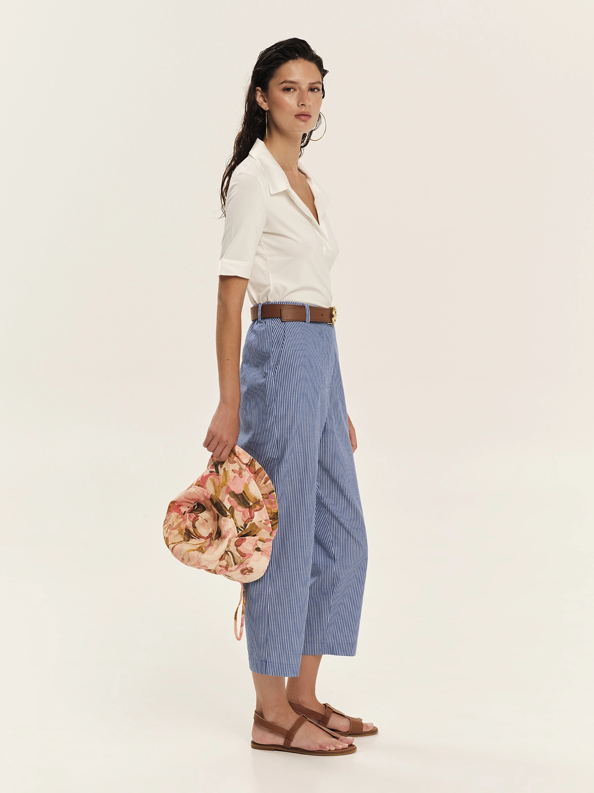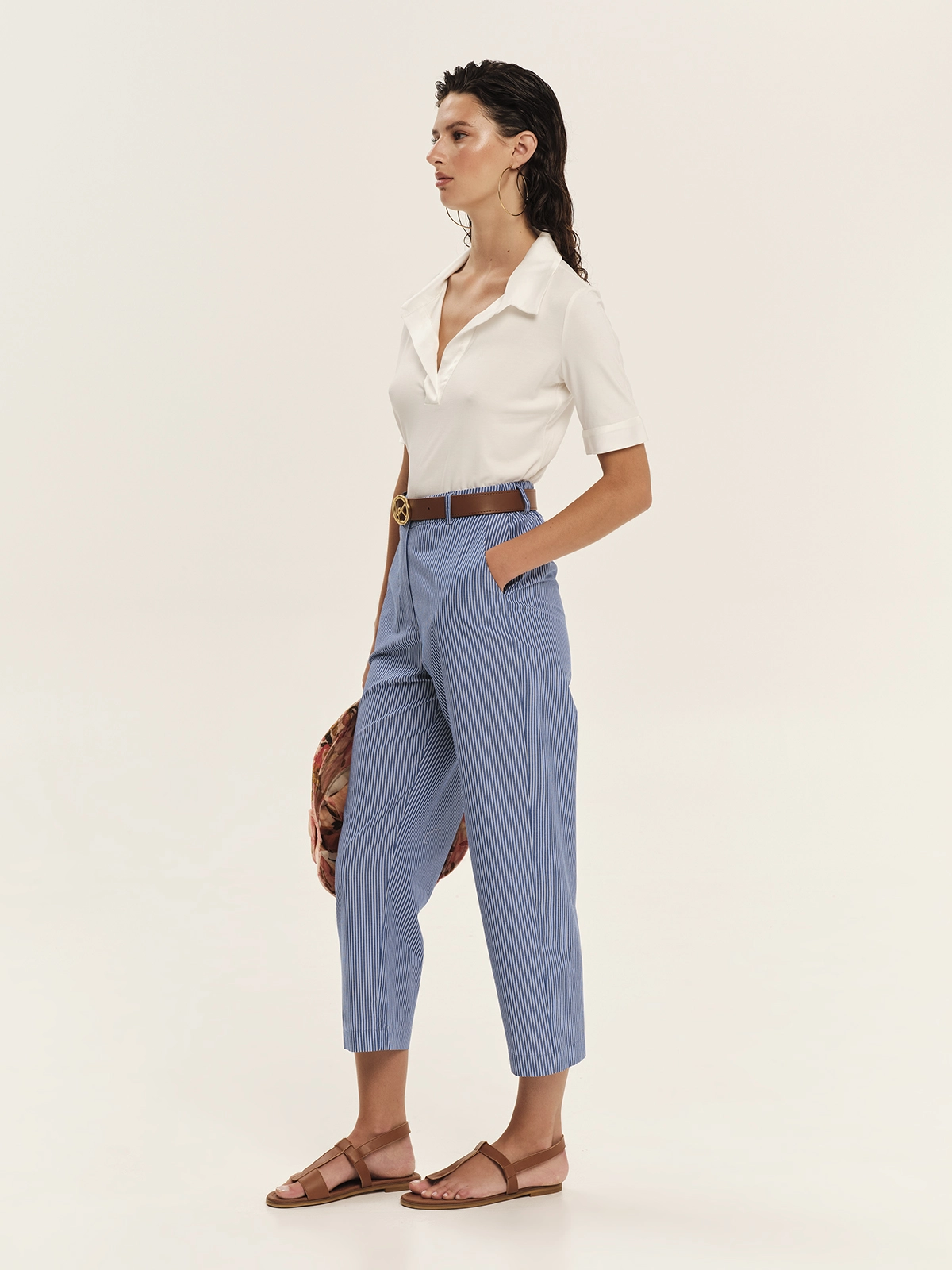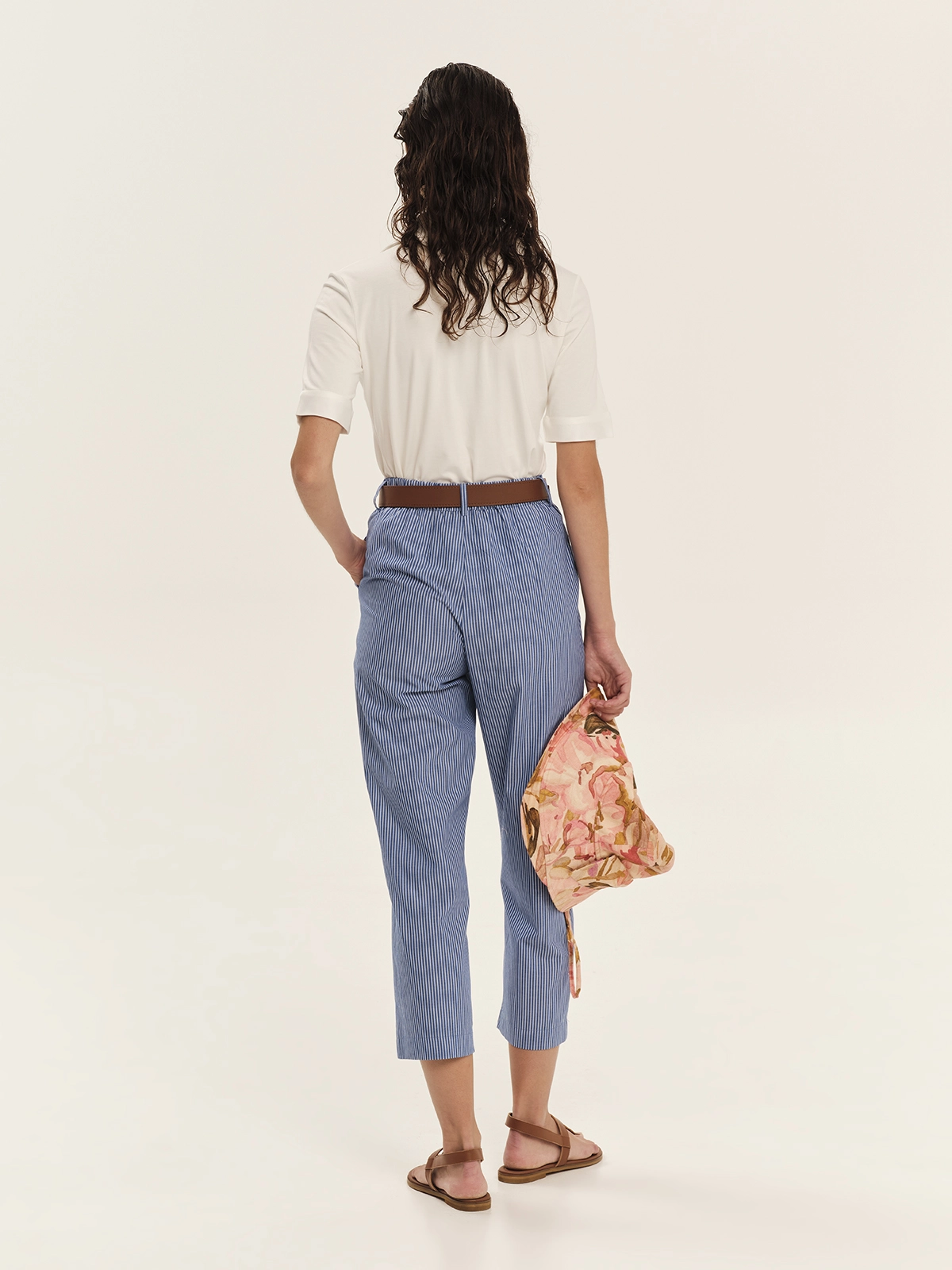 Straight-leg trousers crafted from 100% cotton striped poplin in playful summer shades, featuring an elasticated waist band at the back for a comfortable fit. It comes with side pockets and a front zip-and-button closure, combining practicality with elegance. A premium pair of trousers that blends comfort, contemporary style, and summer-ready appeal—perfect for daywear and casual-chic looks.