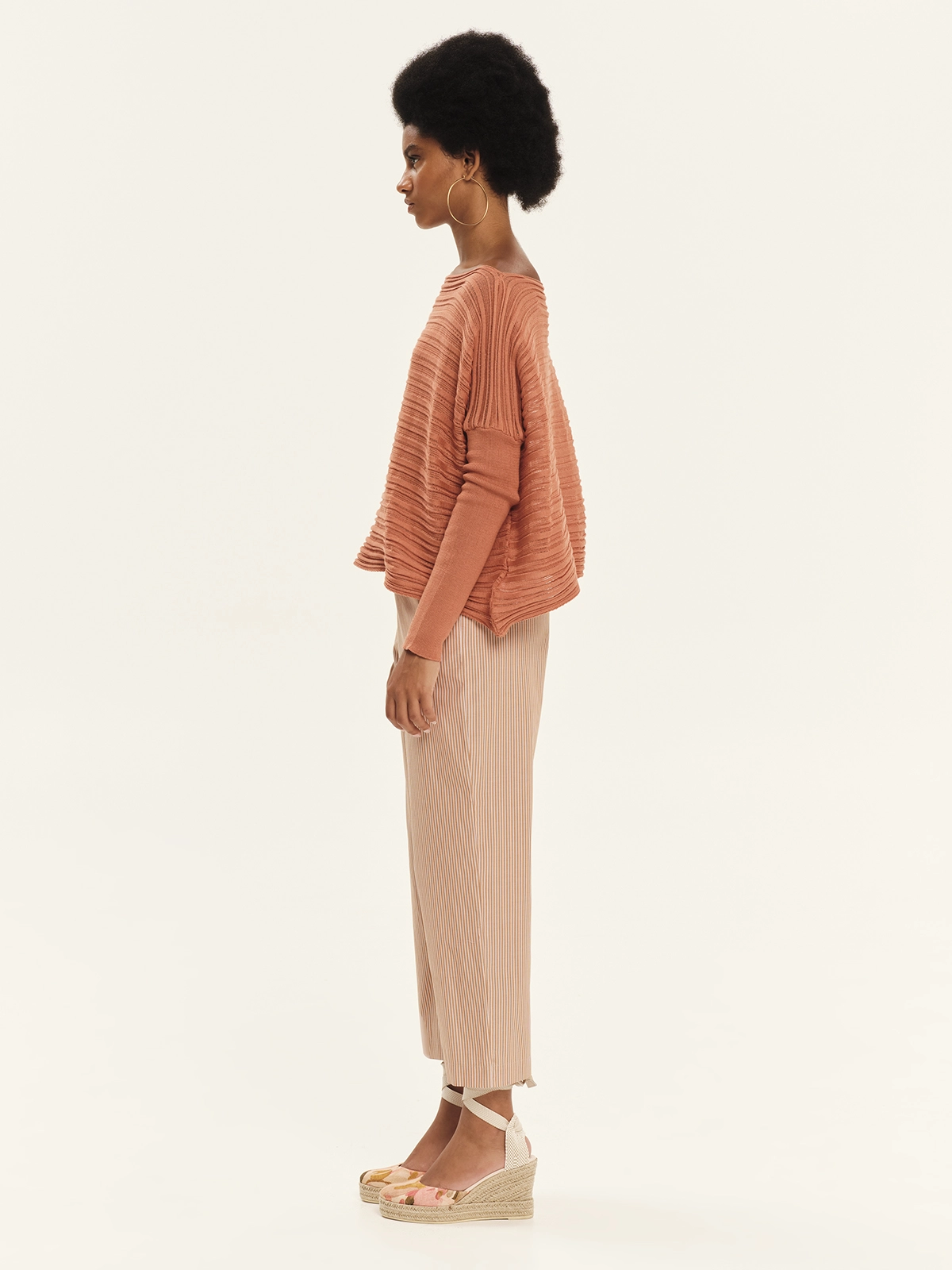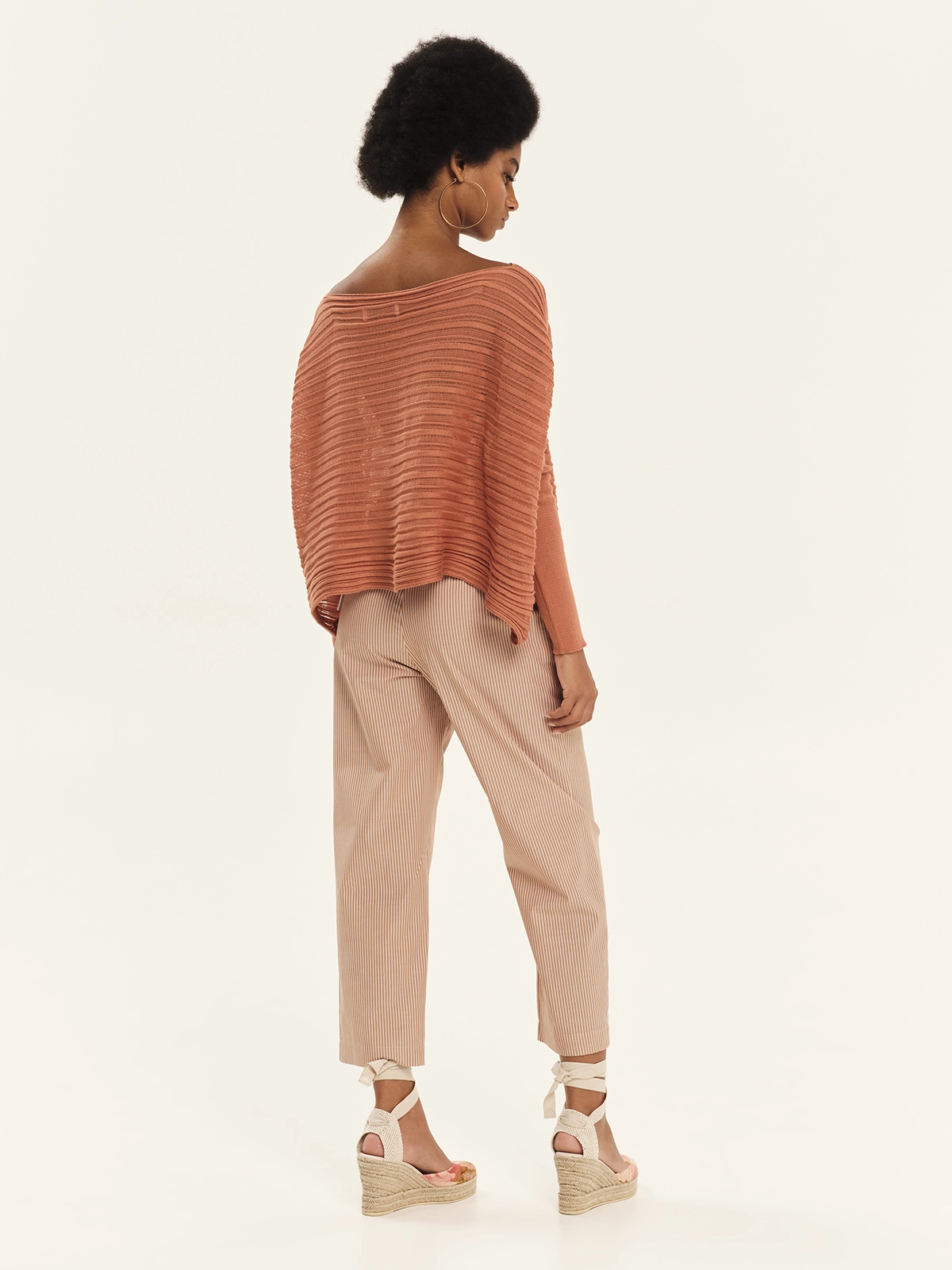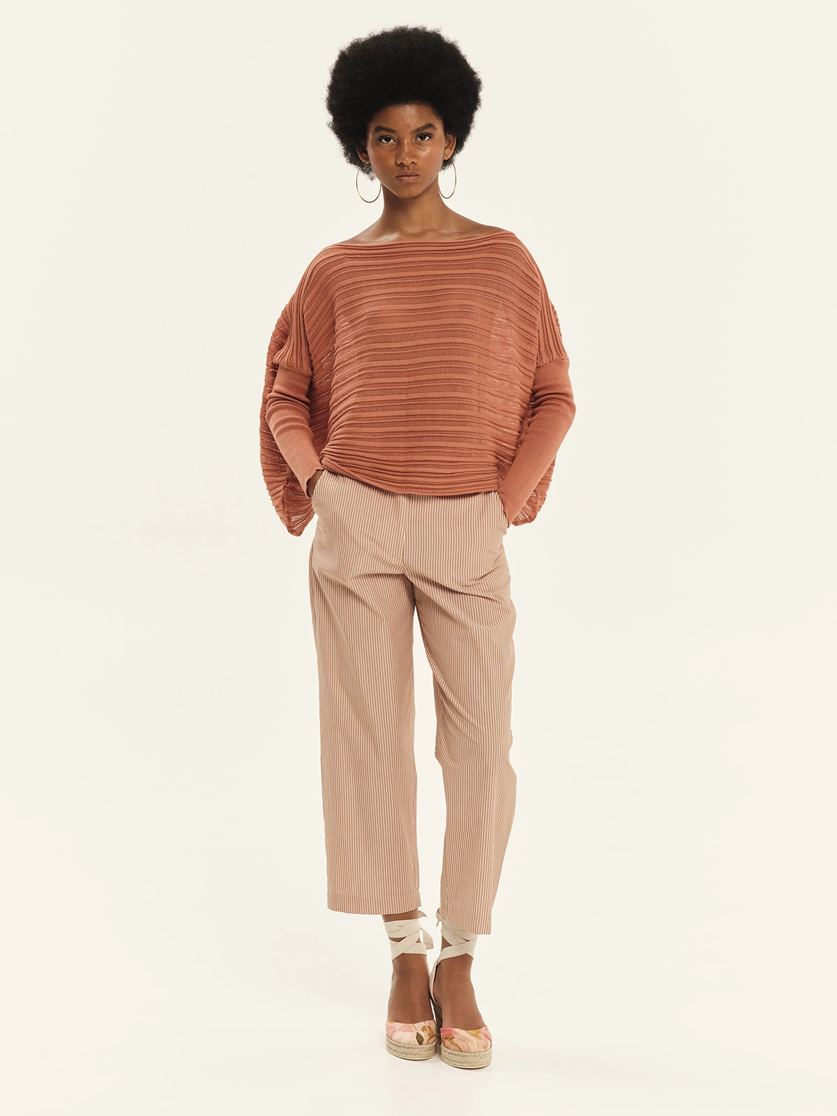 Straight-leg trousers crafted from 100% cotton striped poplin in playful summer shades, featuring an elasticated waist band at the back for a comfortable fit. It comes with side pockets and a front zip-and-button closure, combining practicality with elegance. A premium pair of trousers that blends comfort, contemporary style, and summer-ready appeal—perfect for daywear and casual-chic looks.